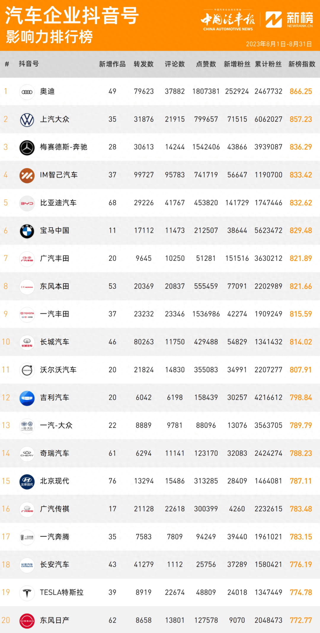 》取新榜联手《外国汽车报,00多家汽车企业汇集入驻抖音的1,量、点赞数量、累计粉丝数量等度数据分析阐发按照其抖音号新删做品数量、转发数量洒水车价格查询、评论数,汽车企业抖音劣良视频”两项“新榜指数”最末得出了“汽车企业抖音号影响力”和“。