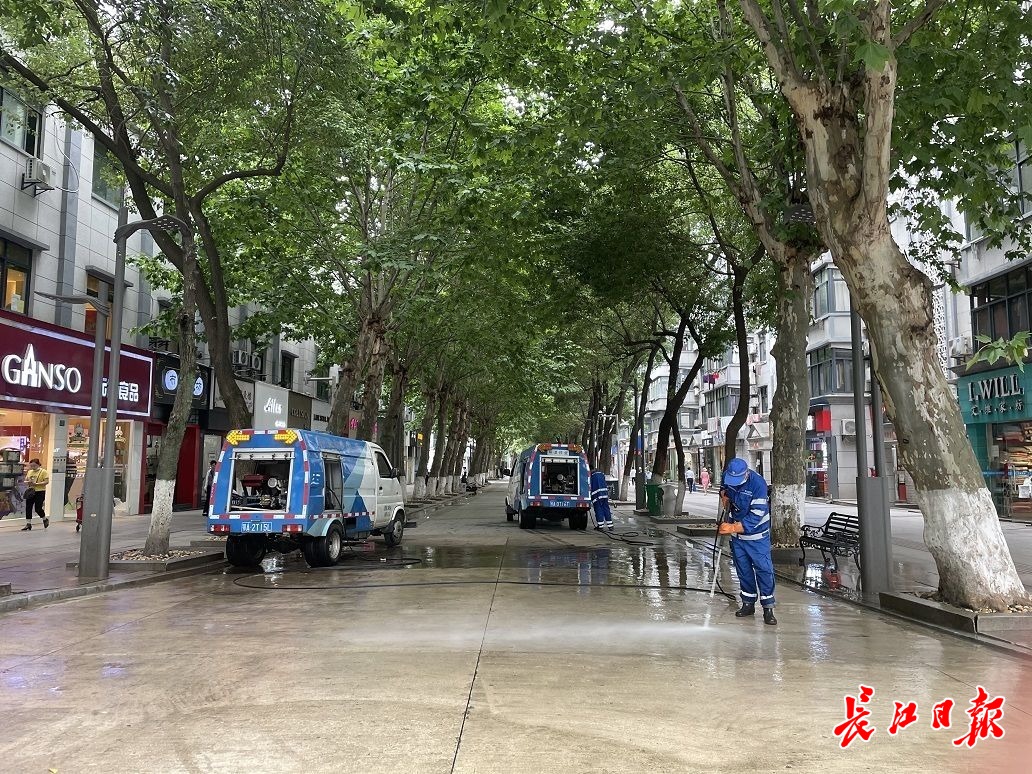 程力环卫清扫车日上午28,高压水枪冲刷地面保洁员陈明手持,到之处水花所,隙退去黑灰地面和缝。洁剂泡、用刷女刷用水枪冲、用清,“洗澡式”清洗路面武昌惠明路保洁人员,地砖显出本色确保每一块。